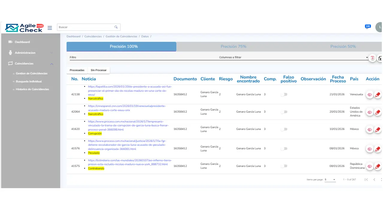El riesgo reputacional es tan importante como el financiero. AgileCheck News automatiza el monitoreo de medios digitales y fuentes abiertas para alertar sobre noticias negativas relacionadas con clientes, contrapartes o terceros.